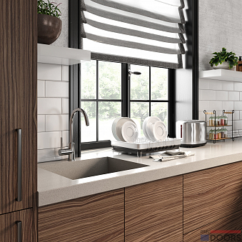 Подвесные ящики не предусмотрены, что позволяет размещать кухню по стене с окном.