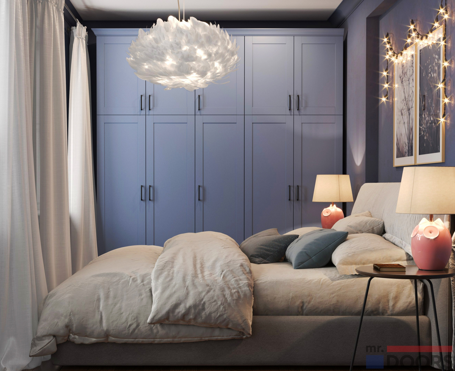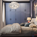 Корпус шифоньера выполнен из прочной и экологичной ламинированной плиты в декоре «Тауп», фасады — МДФ в эмали «Голубиный». Покрытие матовое, так что никаких отбликов и следов от пальцев на фасадах Shaker заметно не будет. Цвет нейтральный, подходит к спальне, оформленной и в тёмных, и в светлых тонах.