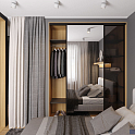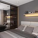 Спальня в серых тонах выполнена в современном стиле. Встроенный шкаф вместительный, система раздвижения «Лайт-А» обеспечивает бесшумное и плавное открывание и закрывание дверей. Вставки в раму сделаны из декоративного стекла «Мателюкс Гавана», есть также зеркальные. Вес конструкции немал, но профиль надёжный, так что двери работают безупречно на протяжении всего срока эксплуатации.