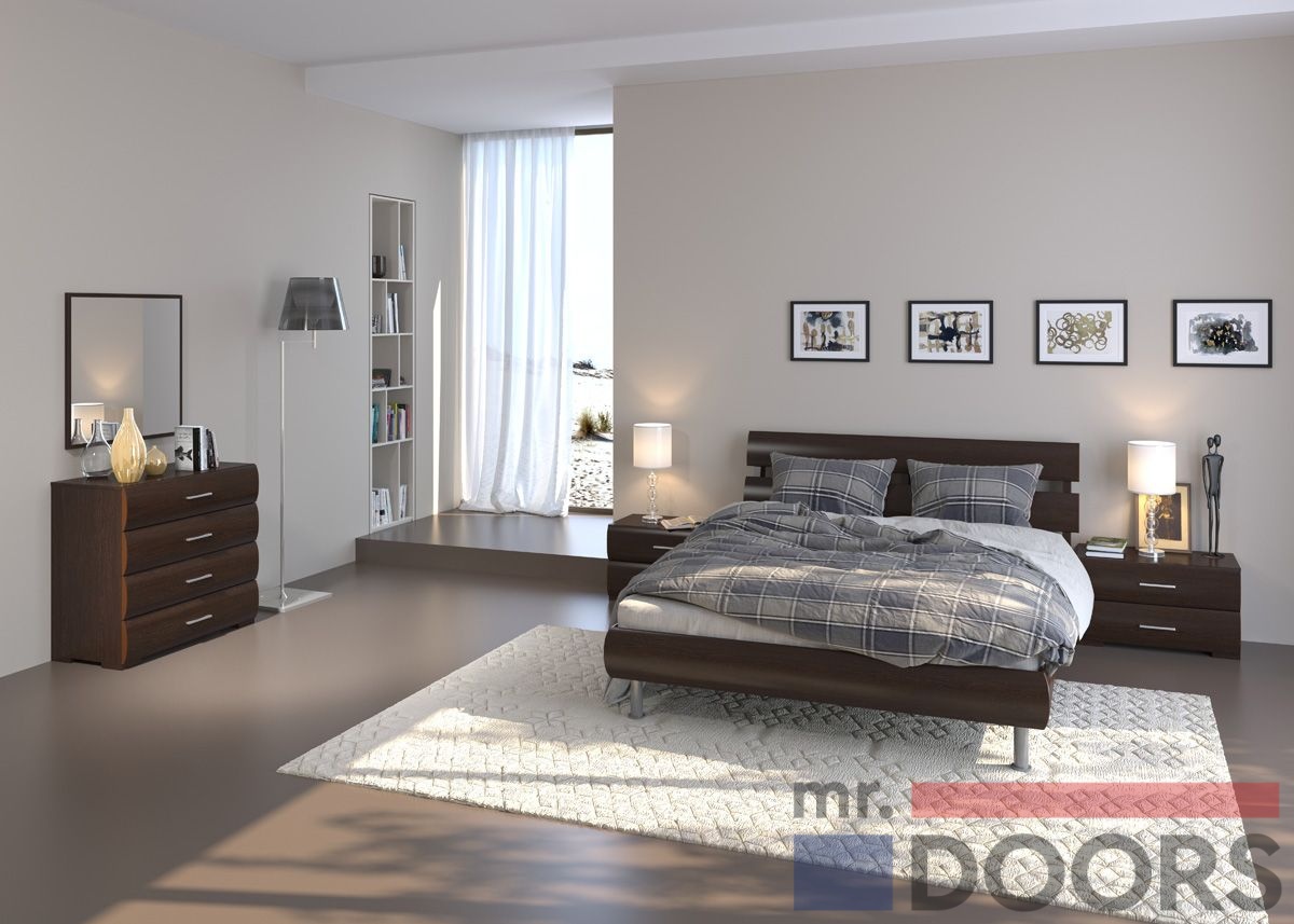 Спальня, коллекция «Мори» (арт. 054) — это комплект из двуспальной кровати, двух тумб и комода, выполненных в декоре «Дуб Торонто». Стильная тёмная поверхность лучше всего сочетается с белыми и вообще светлыми стенами, а также текстилем.