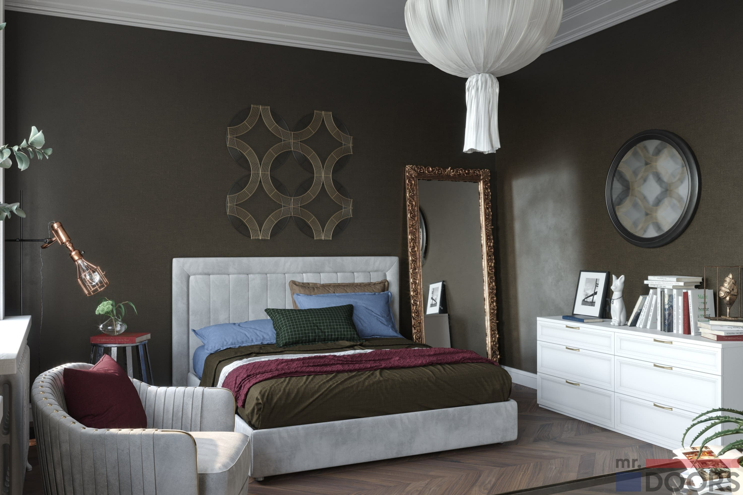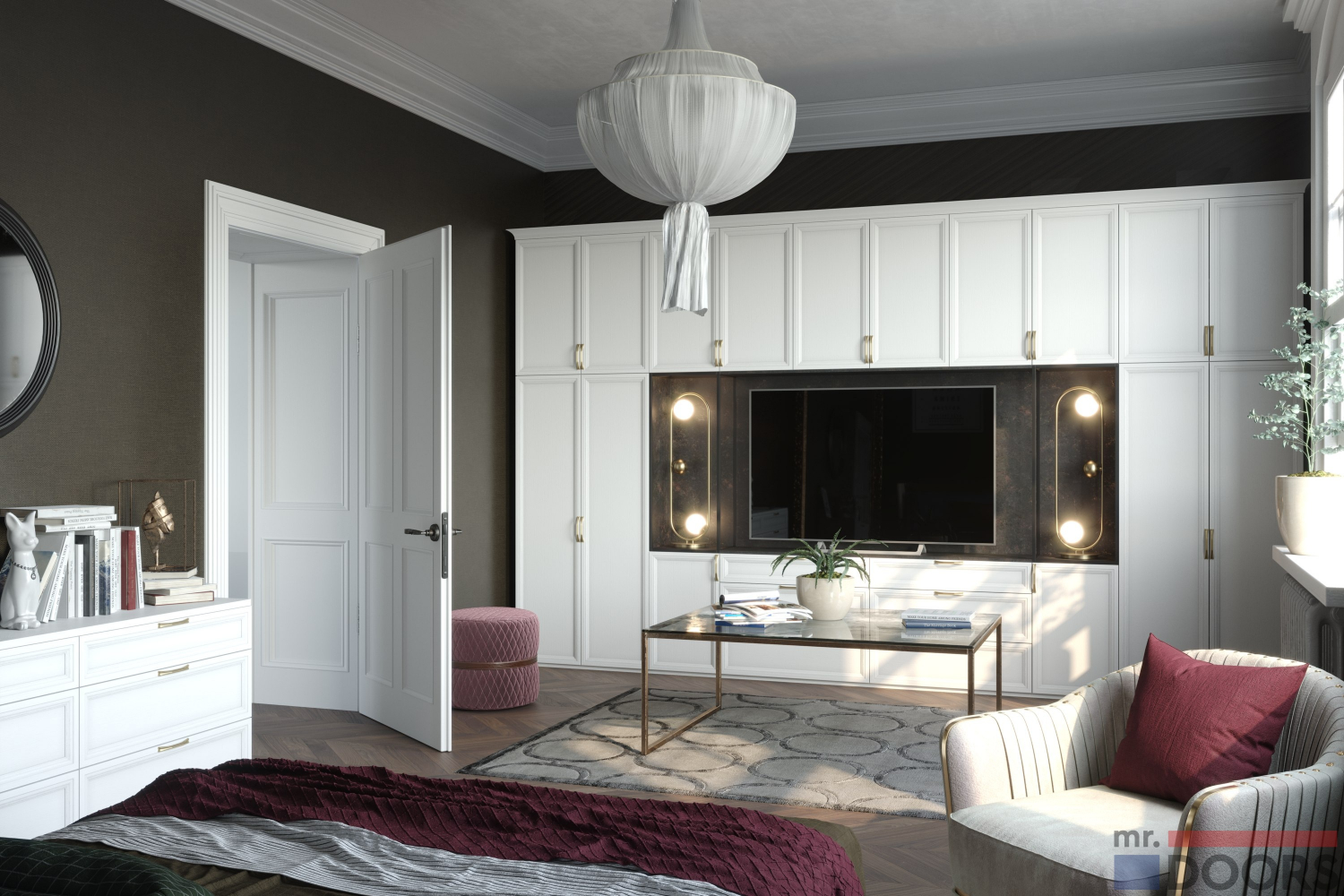 Для создания комода и шкафа использованы ламинированные плиты в декоре «Филвуд белый», фасады «Нувола» в раме из МДФ в плёнке «Эковуд Эдельвейс». Центральная ниша изготовлена на основе алюминиевой системы «Кадро», обрамлена ламинированной плитой «Металлверк». Мебель для спальни изготавливается на заказ по индивидуальным размерам, а это значит, что габариты шкафа и ниши клиент определяет по своему усмотрению — открытая секция может служить ТВ-юнитом или использоваться как система хранения. Наполнение шкафа варьируется в зависимости от потребностей клиента.