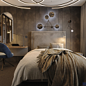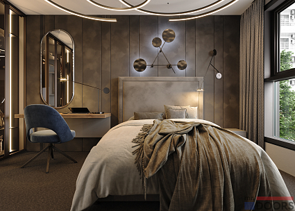 Проект спальни в стиле «Модерн» в темно-бежевых тонах. Спальня оборудована встроенной гардеробной с раздвижными дверями, в которой найдется место для одежды и обуви. Рядом с удобной двуспальной кроватью расположился консольный туалетный столик с зеркалом.