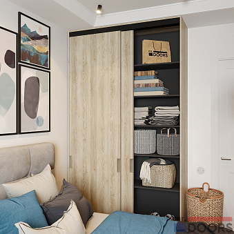 Шкаф-купе с системой раздвижения “Шифт”. “Шифт” - эксклюзивная разработка Mr.Doors. Мы создали безрамные раздвижные двери с мягким и плавным ходом, что обеспечивает дополнительный комфорт от использования.