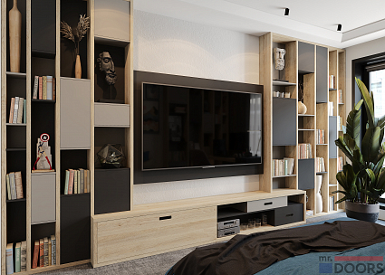 Фасады сделаны из ЛДСП в декорах “Дуб Гладстон”, “Графит” и “Муссон” (у стеллажа вокруг телевизора).